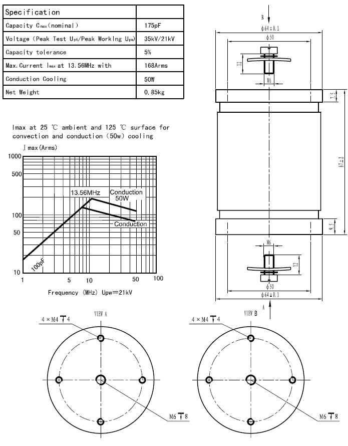 CKT175/25/168固定陶瓷高压真空电容器采用陶瓷外壳、真空介质、具有耐压高、体积小、Q值高、性能稳定可靠价格低廉等特点,广泛用于感应加热、介质加热、通讯、广播等设备。