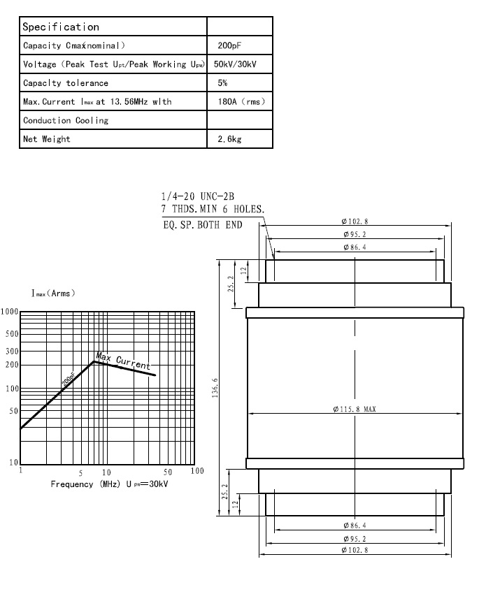 CKT200/42/280型固定陶瓷高压真空电容器采用陶瓷外壳、真空介质、具有耐压高、体积小、Q值高、性能稳定可靠价格低廉等特点,广泛用于感应加热、介质加热、通讯、广播等设备。