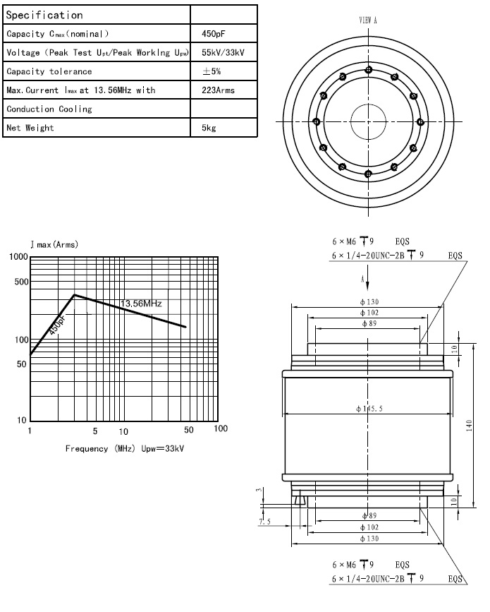 CKT450/33/170型固定陶瓷高压真空电容器采用陶瓷外壳、真空介质、具有耐压高、体积小、Q值高、性能稳定可靠价格低廉等特点,广泛用于感应加热、介质加热、通讯、广播等设备。 参考型号 COMET: CF3C-450F