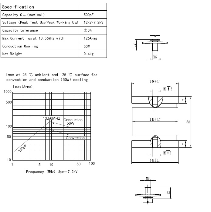CKT500/8.5/126固定陶瓷高压真空电容器采用陶瓷外壳、真空介质、具有耐压高、体积小、Q值高、性能稳定可靠价格低廉等特点,广泛用于感应加热、介质加热、通讯、广播等设备。