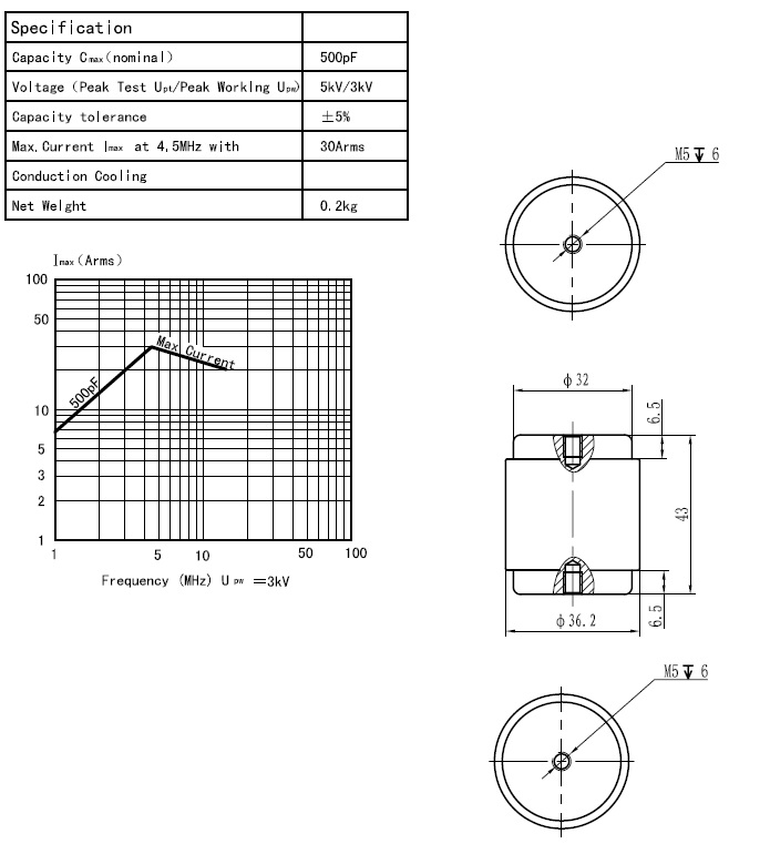 CKT500/3.5/30固定陶瓷高压真空电容器采用陶瓷外壳、真空介质、具有耐压高、体积小、Q值高、性能稳定可靠价格低廉等特点,广泛用于感应加热、介质加热、通讯、广播等设备。