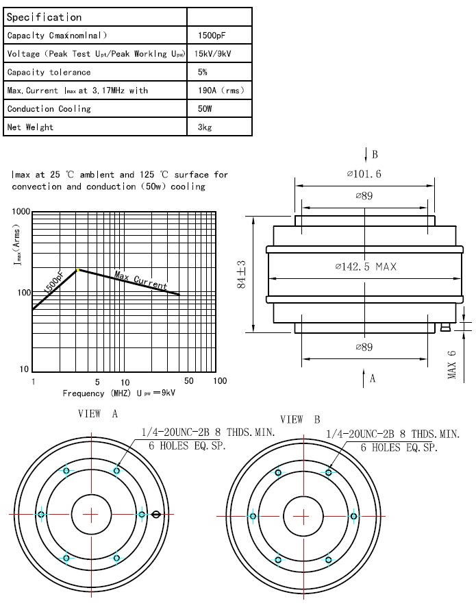 CKT1500/10/190固定陶瓷高压真空电容器采用陶瓷外壳、真空介质、具有耐压高、体积小、Q值高、性能稳定可靠价格低廉等特点,广泛用于感应加热、介质加热、通讯、广播等设备。