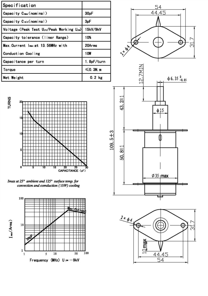 CKTB30/9/20型可变陶瓷高压真空电容器采用陶瓷外壳、真空介质、具有耐压高、体积小、Q值高、性能稳定可靠、价格低廉等特点,广泛用于感应加热、介质加热、通讯、广播等设备。