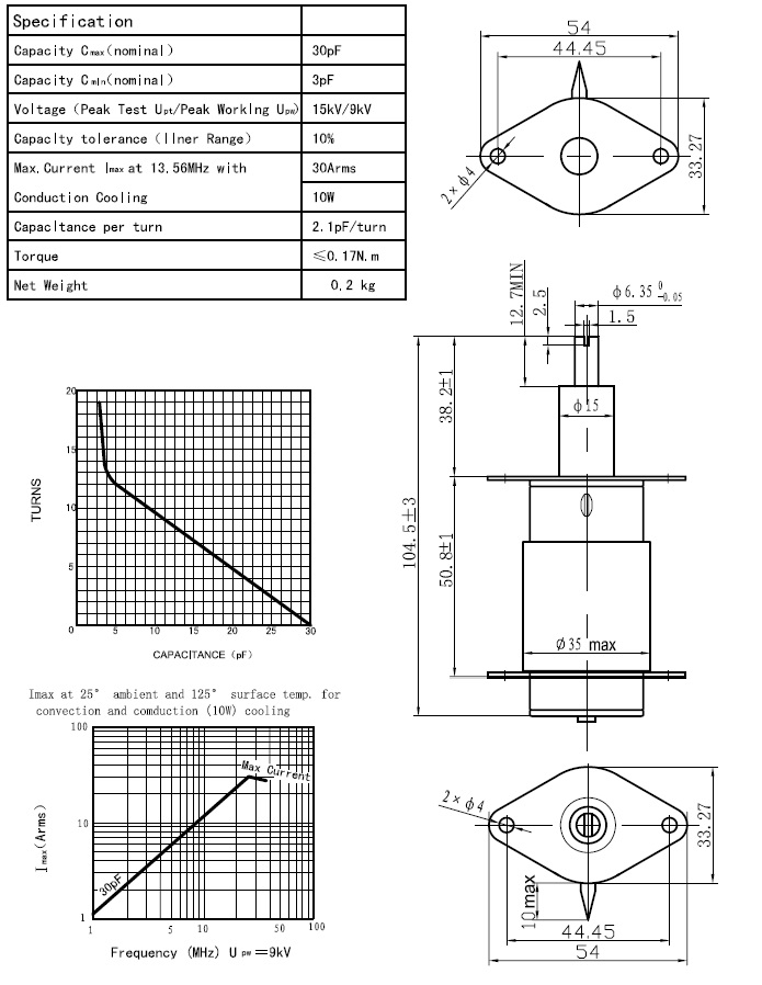 CKTB30/9/30型可变陶瓷高压真空电容器采用陶瓷外壳、真空介质、具有耐压高、体积小、Q值高、性能稳定可靠、价格低廉等特点,广泛用于感应加热、介质加热、通讯、广播等设备。