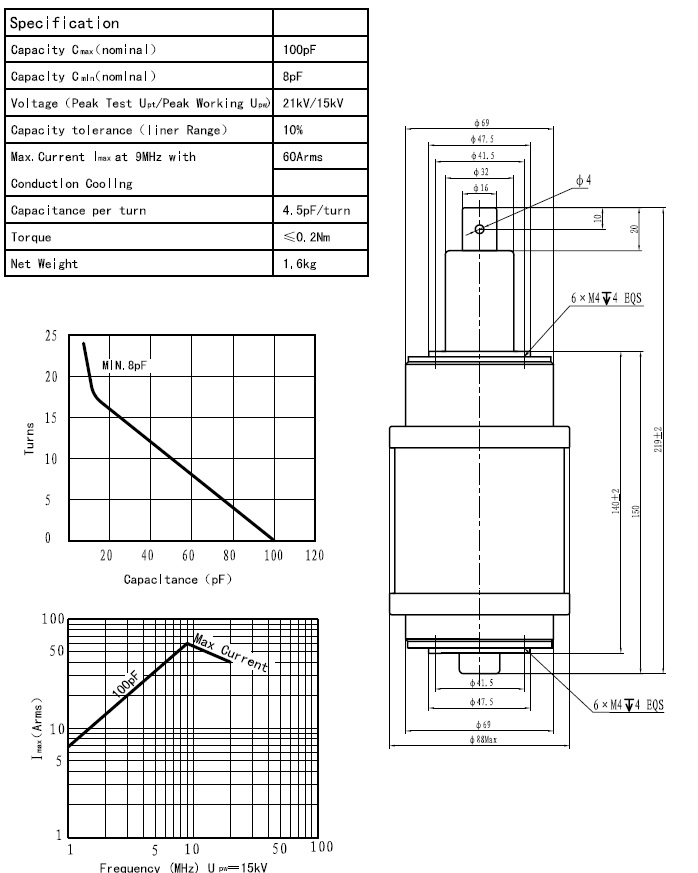 CKTB100/15/60型可变陶瓷高压真空电容器采用陶瓷外壳、真空介质、具有耐压高、体积小、Q值高、性能稳定可靠、价格低廉等特点,广泛用于感应加热、介质加热、通讯、广播等设备。