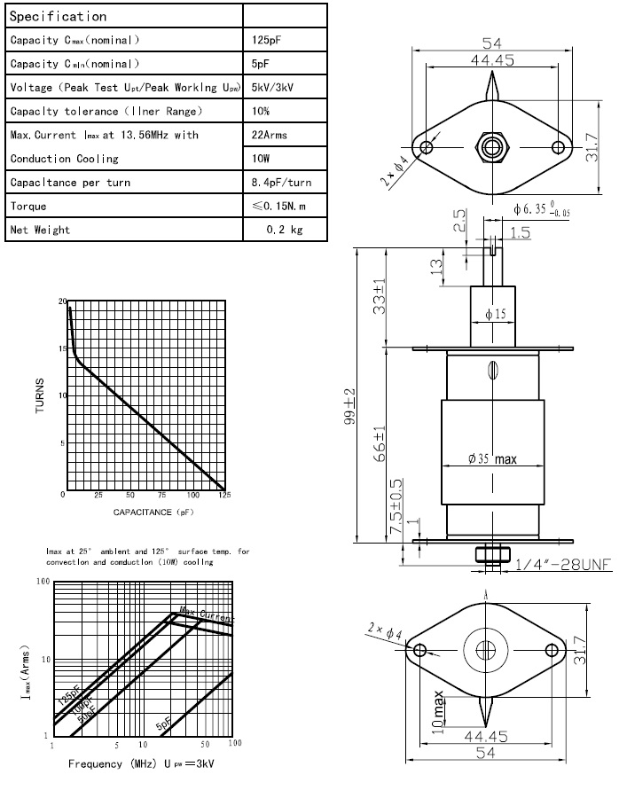 CKTB125/3.5/22可变陶瓷高压真空电容器采用陶瓷外壳、真空介质、具有耐压高、体积小、Q值高、性能稳定可靠、价格低廉等特点,广泛用于感应加热、介质加热、通讯、广播等设备。
