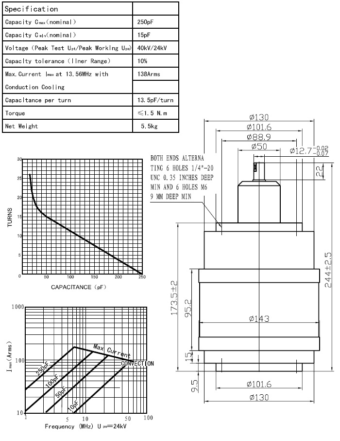 CKTB250/28/138型可变陶瓷高压真空电容器采用陶瓷外壳、真空介质、具有耐压高、体积小、Q值高、性能稳定可靠、价格低廉等特点,广泛用于感应加热、介质加热、通讯、广播等设备。