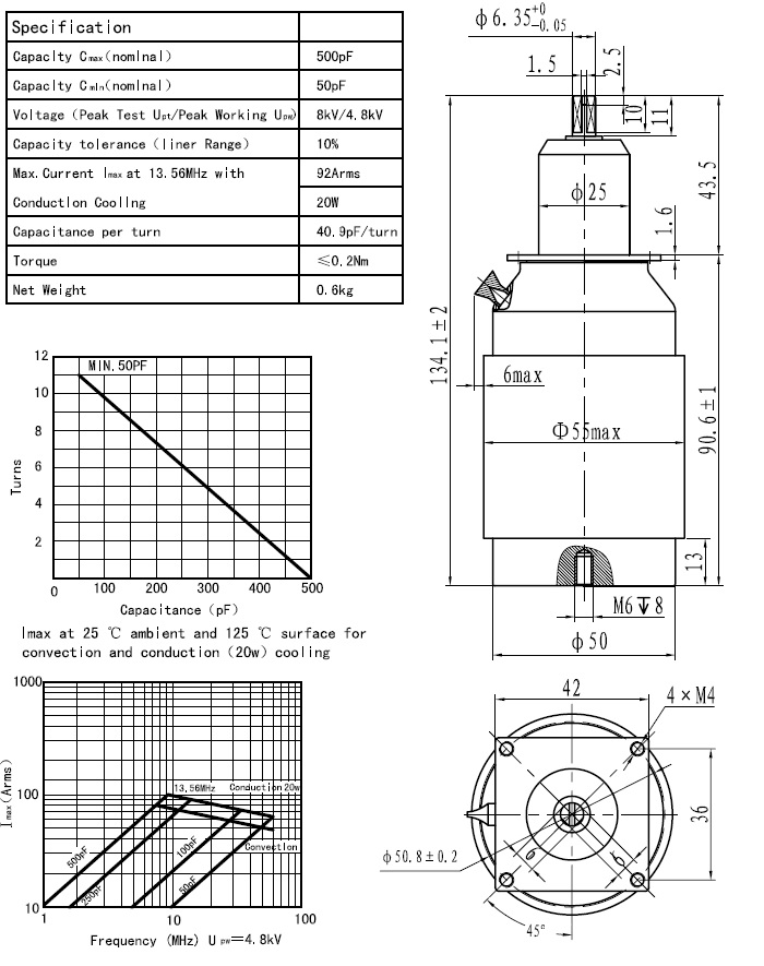 CKTB500/5.6/92可变陶瓷高压真空电容器采用陶瓷外壳、真空介质、具有耐压高、体积小、Q值高、性能稳定可靠、价格低廉等特点,广泛用于感应加热、介质加热、通讯、广播等设备。