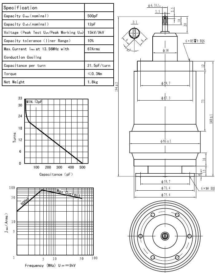 CKTB500/10/67(Ⅳ)可变陶瓷高压真空电容器采用陶瓷外壳、真空介质、具有耐压高、体积小、Q值高、性能稳定可靠价格低廉等特点,广泛用于感应加热、介质加热、通讯、广播等设备
