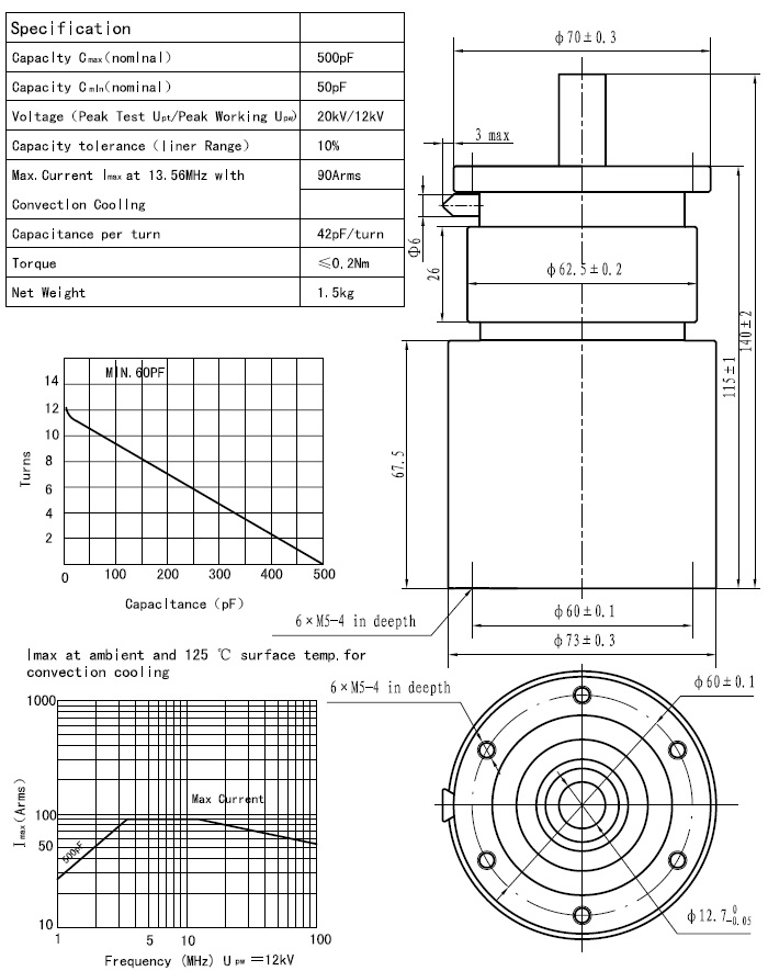 CKTB500/15/90可变陶瓷高压真空电容器采用陶瓷外壳、真空介质、具有耐压高、体积小、Q值高、性能稳定可靠、价格低廉等特点,广泛用于感应加热、介质加热、通讯、广播等设备。