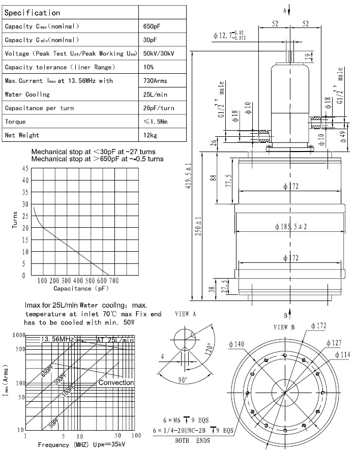 CKTBS650/35/730可变陶瓷高压真空电容器采用陶瓷外壳、真空介质、具有耐压高、体积小、Q值高、性能稳定可靠、价格低廉等特点,广泛用于感应加热、介质加热、通讯、广播等设备。
