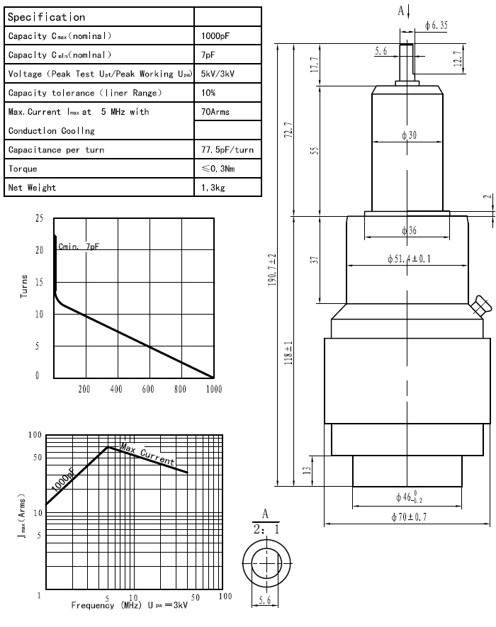 CKTB1000/3.5/70(I)可变陶瓷高压真空电容器采用陶瓷外壳、真空介质、具有耐压高、体积小、Q值高、性能稳定可靠、价格低廉等特点,广泛用于感应加热、介质加热、通讯、广播等设备。