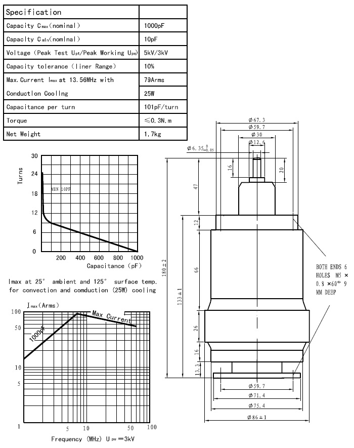 CKTB1000/3.5/79可变陶瓷高压真空电容器采用陶瓷外壳、真空介质、具有耐压高、体积小、Q值高、性能稳定可靠、价格低廉等特点,广泛用于感应加热、介质加热、通讯、广播等设备。