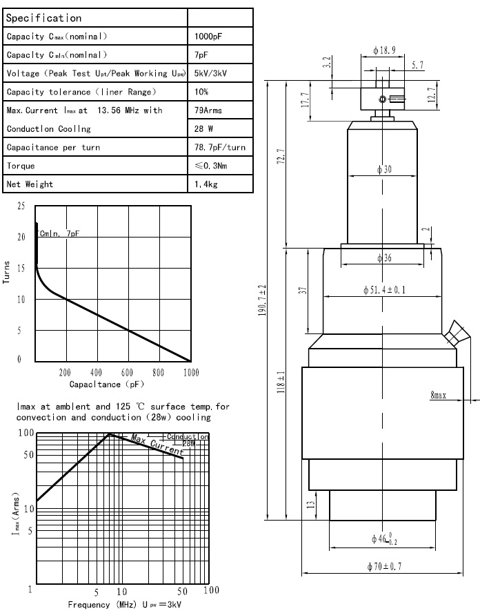 CKTB1000/3.5/79(II)可变陶瓷高压真空电容器采用陶瓷外壳、真空介质、具有耐压高、体积小、Q值高、性能稳定可靠价格低廉等特点,广泛用于感应加热、介质加热、通讯、广播等设备。