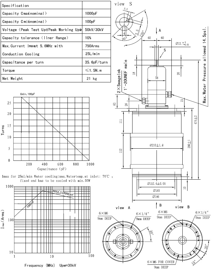 CKTBS1000/35/750可变陶瓷高压真空电容器采用陶瓷外壳、真空介质、具有耐压高、电流大、体积小、 Q 值高、性能稳定可靠、 水冷却、允许通过电流大等特点,广泛用于通讯、广播等设备,作调谐元件用 。