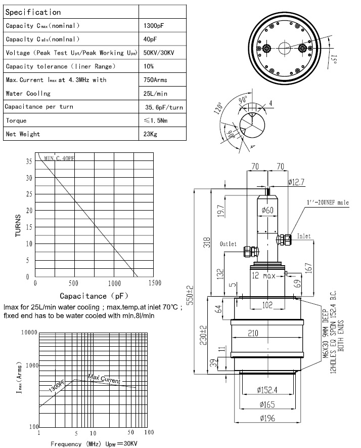 CKTBS1300/35/750(II)可变陶瓷高压真空电容器采用陶瓷外壳、真空介质、具有耐压高、体积小、Q值高、性能稳定可靠、价格低廉等特点,广泛用于感应加热、介质加热、通讯、广播等设备