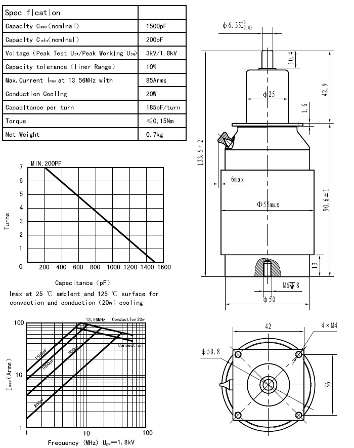 CKTB1500/2.1/85(I)可变陶瓷高压真空电容器采用陶瓷外壳、真空介质、具有耐压高、体积小、Q值高、性能稳定可靠价格低廉等特点,广泛用于感应加热、介质加热、通讯、广播等设备。