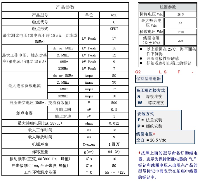 保持型线圈,低消耗功率,在线圈无电压时确保继电器保持其最后的工作状态。体积小,承载电流大,连续电流50A。 接触电阻低而且稳定,损耗小的射频高压真空继电器。 两种可选安装方式,法兰安装或螺母安装。 高压端焊接连接或用螺钉连接可以方便连接。