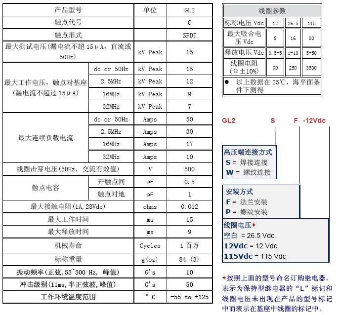 高频负载电压,连续直流下50A,体积小巧,接触电阻低且稳定,低损耗的射频高压继电器。两种可选安装方式,法兰式和螺栓式 螺栓式或焊接式高压接头,接线简单 可更换线圈,使产品功能实现多样化, 可以直接替换KILOVAC的KC-2真空继电器,替换JENNINGS 的RJ2B与RJ2C真空继电器。