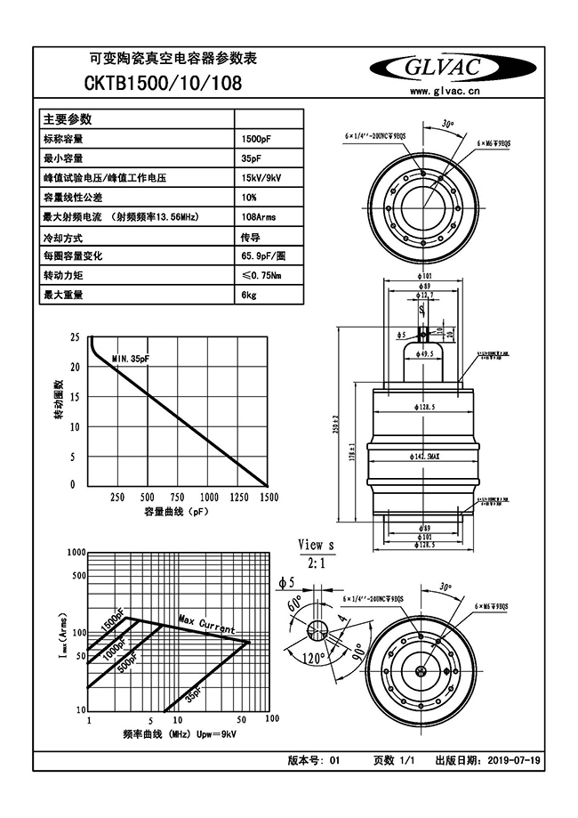 CKTB1500/10/108可变陶瓷高压真空电容器采用陶瓷外壳、真空介质、具有耐压高、体积小、Q值高、性能稳定可靠价格低廉等特点,广泛用于感应加热、介质加热、通讯、广播等设备。