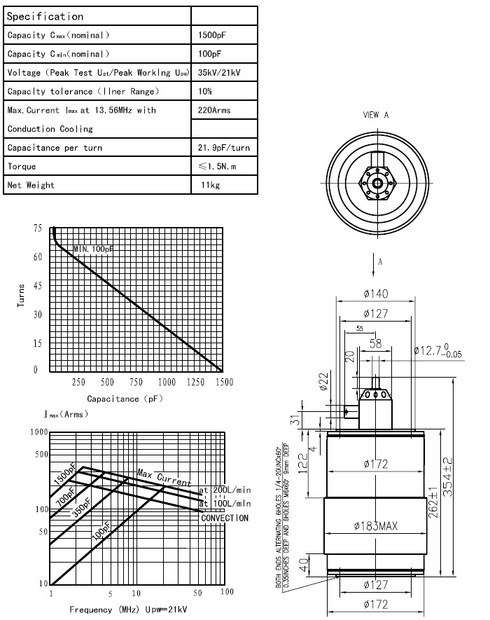 CKTBF1500/24/220可变陶瓷高压真空电容器采用陶瓷外壳、真空介质、具有耐压高、体积小、Q值高、性能稳定可靠、价格低廉等特点,广泛用于感应加热、介质加热、通讯、广播等设备。